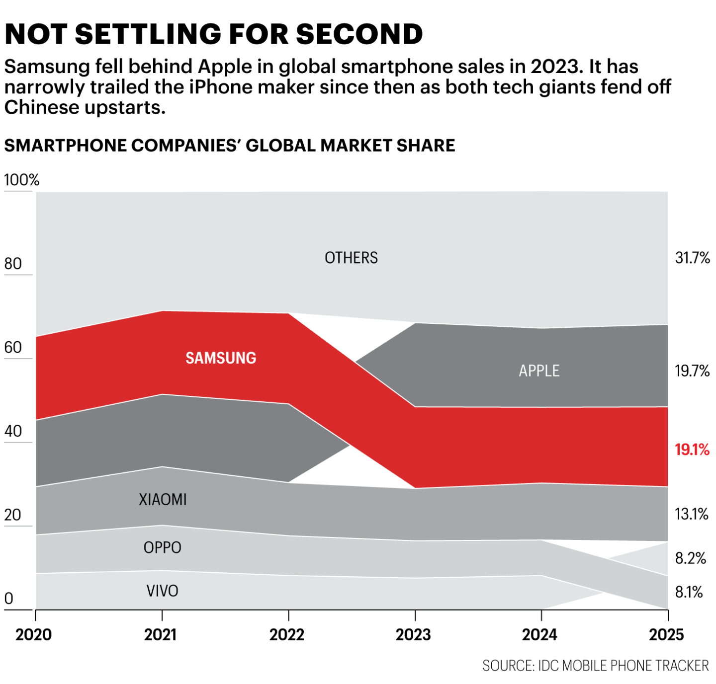 The numbers bear that out. Apple overtook Samsung to become the No. 1 smartphone seller in 2023 and has maintained a slim lead over its Korean rival since then, according to International Data Corporation, a market intelligence firm. And up-and-coming Chinese firms like Xiaomi (for phones) and TCL (for TVs) are starting to encroach on Samsung’s premium markets.
