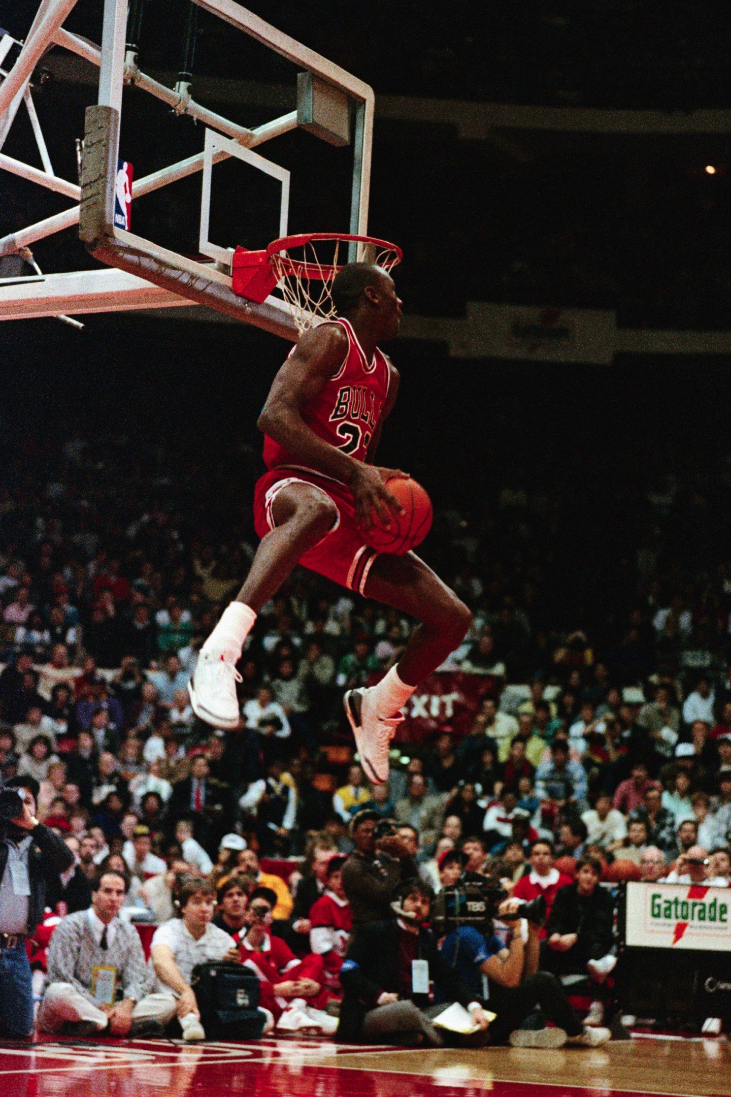 Carefully crafted as it was, the commercial image might not have taken flight had it not been underscored by the drama that took place on a weekend in February 1987, when Jordan won the NBA’s Slam-Dunk contest with a jam for the ages on his final attempt. Check out the grainy, slow-motion footage. It’s all there. The style, the flair, the tongue—flashbulbs sparkling like starlight as he twisted and leaned and thrust the ball through the rim. From that day forward, it was the shoes. America had to have ’em.