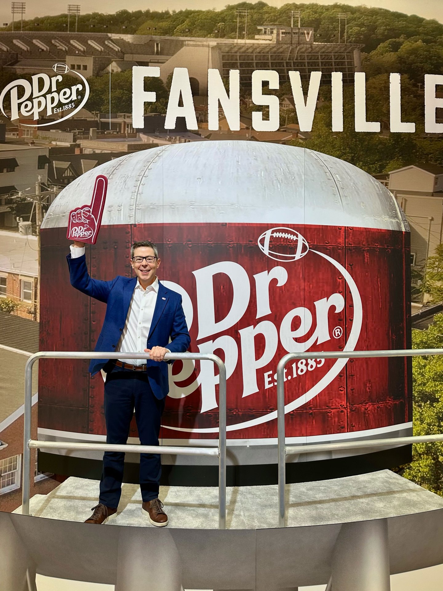 KDP’s nameplate prospers greatly from its role as the leading sponsor of college football. This will be the seventh season it’s been airing ads conjuring a fantasy suburb dubbed “Fansville” whose twin obsessions are the college gridiron and Dr Pepper. Babies emerge from the womb wearing football jerseys and sports caps. Parents bawl out their kids for hiding soccer magazines under their mattresses. Retired football star turned actor Brian Bosworth plays a sheriff chugging Dr Pepper from a quart bottle. Cofer’s so all in on “Fansville” that in December he appeared on one of his Taste Test With Tim episodes shown on YouTube at the SEC championships festooned in a Dr Pepper–labeled football jersey, declaring, “What’s more classic than home-gating and tailgating!”