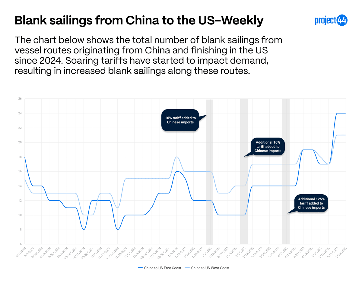 “The East Coast is set to see a peak of 24 blank sailings in the last week of May, a 100% increase since new tariffs began in February, with the West Coast close behind at 21, or a 31% increase,” the company says.