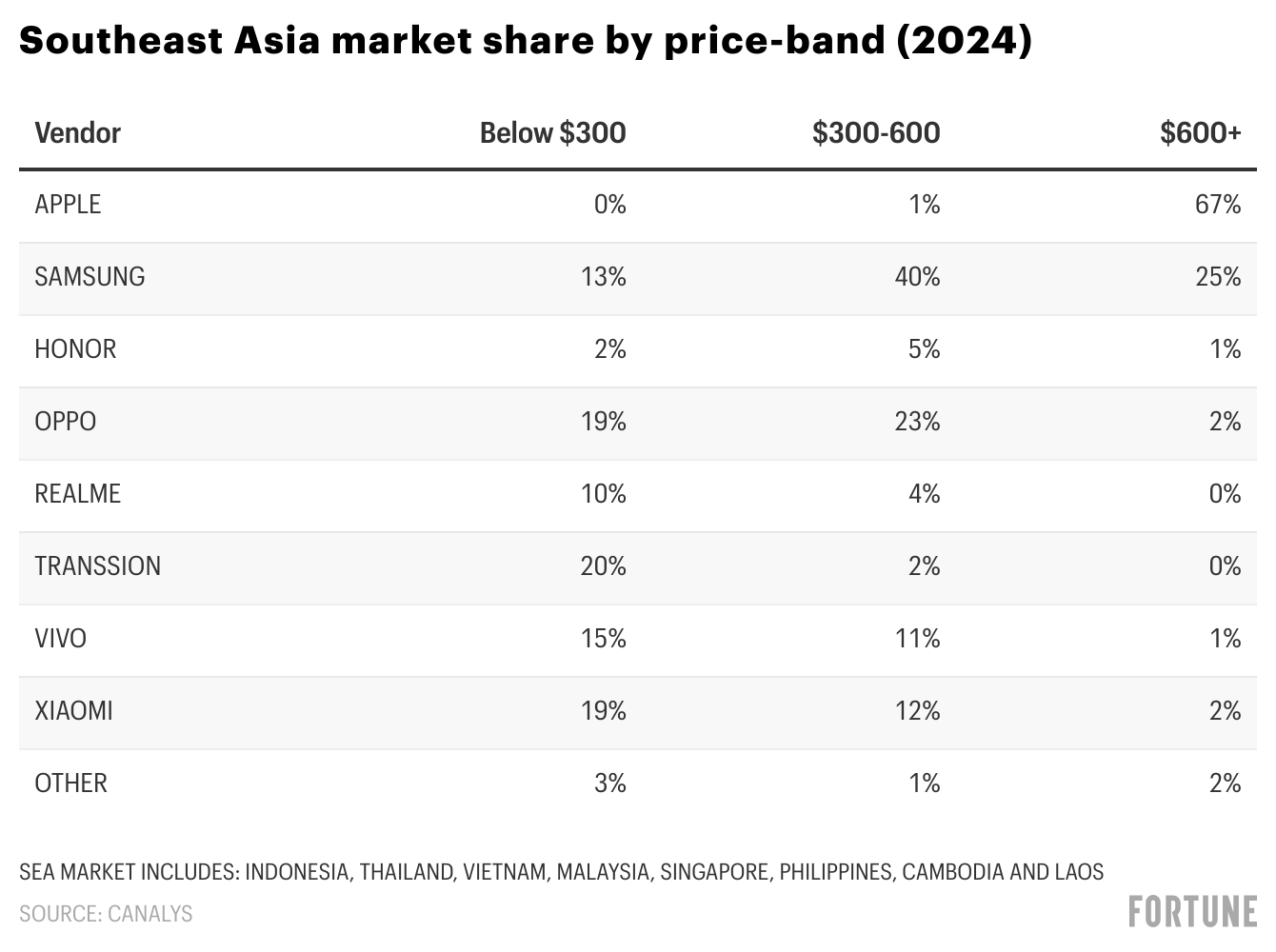 In Southeast Asia, Apple and Samsung together make up more than 90% of the market for smartphones over $600, according to data from market intelligence firm Canalys. Yet “brands like Xiaomi, vivo, Oppo, and Transsion dominate the lower price segments,” Sheng Win Chow, a smartphone analyst at Canalys, says.