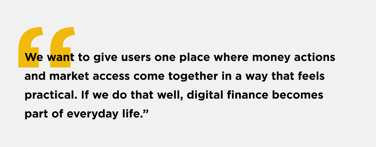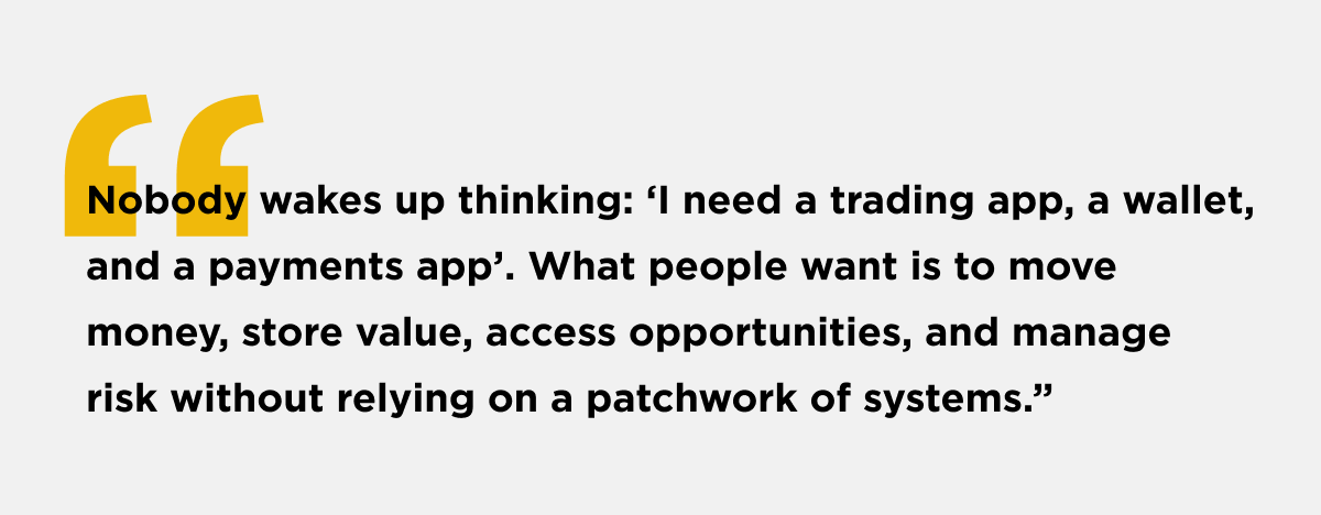 For He, this disconnect reflects a mismatch between how the technology developed and how people actually want to use it. “Nobody wakes up thinking: ‘I need a trading app, a wallet, and a payments app.’ What [people] want is to move money, store value, access opportunities, and manage risk without relying on a patchwork of systems.”