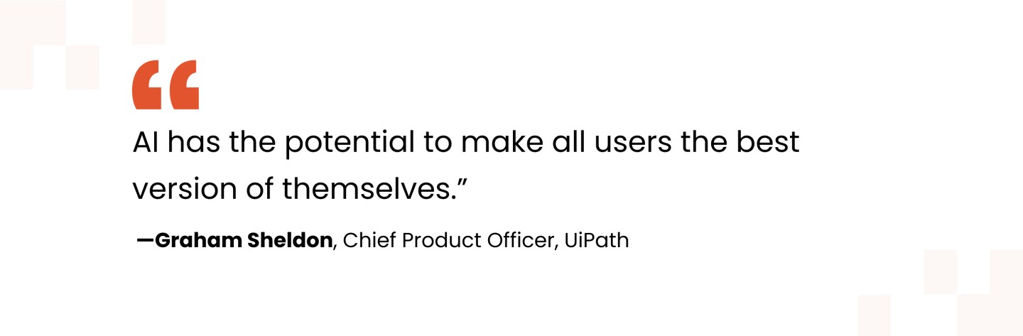 Traditional automation handles rigid, rule-based work. AI agents, when equipped with the right tools and context, take that automation and scale to more complex creative determinations and recommendations rather than simply following predefined steps. This agentic approach is the core of the next wave of automation, in which AI can surface insights and trends to guide human decision-making. With an orchestration layer, enterprises can deploy the right mix of agents, robots, and human experts for each task across complex enterprise workflows while maintaining full visibility and governance. The result allows even junior employees to serve as skilled managers rather than rank-and-file operators. This combination of robots, agents, and people with orchestration is what the UiPath Platform is built on.
