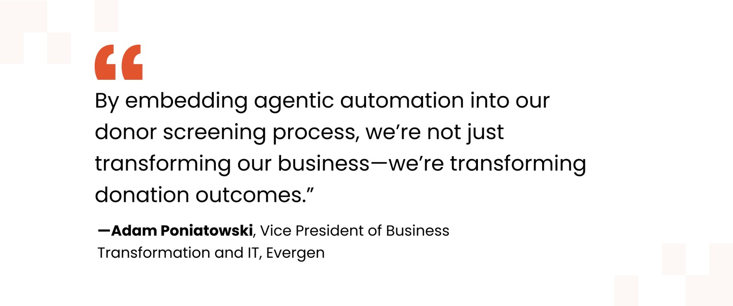 “By embedding agentic automation into our donor screening process, we’re not just transforming our business—we’re transforming donation outcomes,” says Poniatowski. “This is automation and AI with a direct, measurable impact on patients’ lives.”