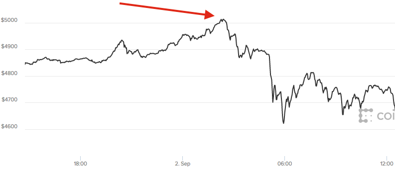 Finally, it should be noted that Bitcoin crossed $5,000 on an index used by the trade publication Coindesk, but not by other major indexes. This is significant because Coindesk’s BPI index includes prices from several Asian exchanges, where prices are typically higher than US or European one. Here’s a screenshot showing the milestone (the time shown is GMT):