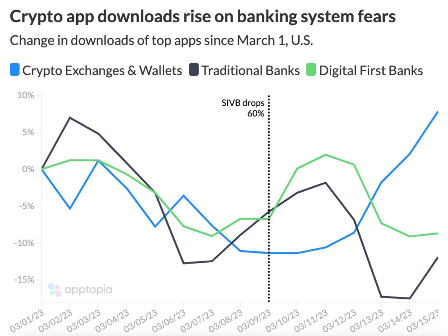 The collapse this month of Silicon Valley Bank and other banks catering to crypto clients felt like yet another instance of bad news for a crypto industry that’s seen more than its fair share in the last six months. But the banking crisis has come with a silver lining: According to data from Apptopia, downloads of crypto apps have jumped more than 15% while those of banking apps have fallen around 5% during the same time.