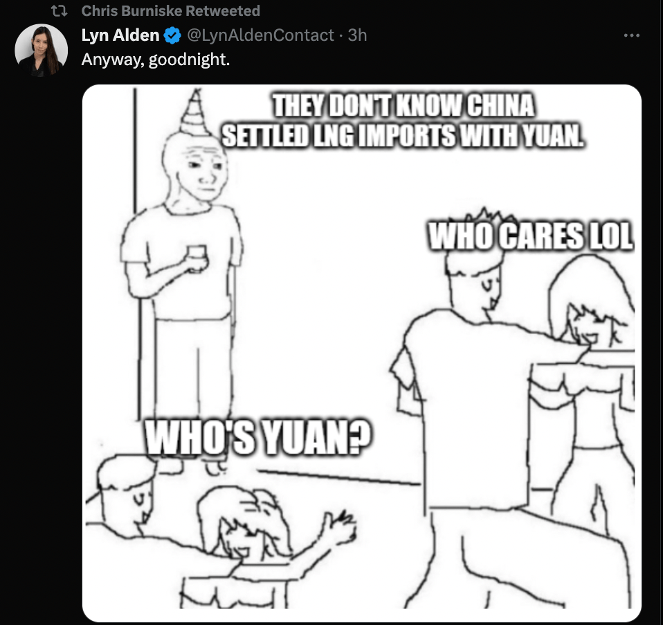 China Dailyreported this week that a state oil company had conducted a natural gas transaction with French energy giant Total and that it had been settled in yuan. The deal, conducted on a Shanghai exchange, was the first of its kind and important enough for Chinese state media to tout its significance. This news is not typical fodder for a crypto newsletter that is, as regular readers know, about topics like Bitcoin and U.S. blockchain companies. But step back and you might see a connection.
