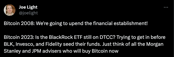 While there may have been private whispers decrying Bankman-Fried’s false allegiance to the crypto ideology in the name of arbitrage opportunities, the vast majority of the industry was happy to hitch itself to his wagon while the money was flowing. Those who passed up investments did not do so with grave warnings. The only group that seemed to voice any opposition during his peak was hardcore Bitcoiners, and of course, the “dumb motherfuckers” of DeFi, right before FTX fell.