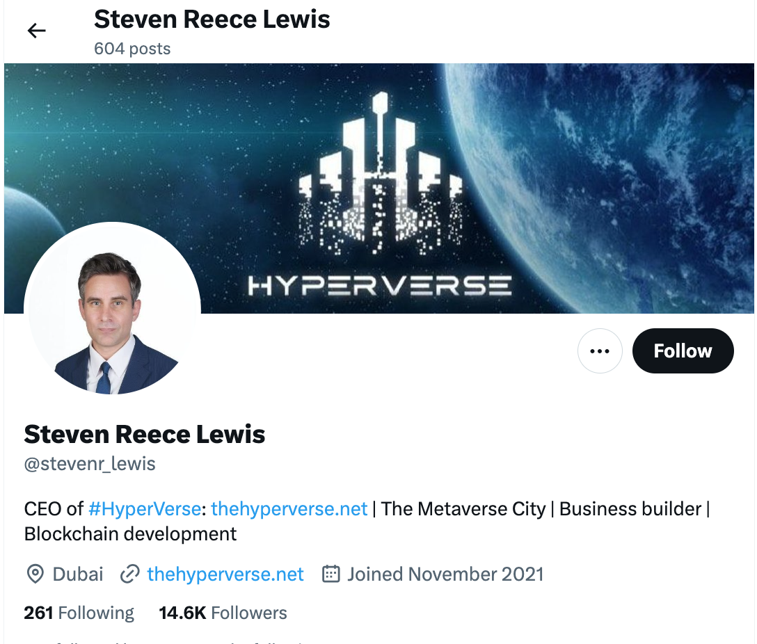 Lewis apparently doesn’t have a LinkedIn account, with his online presence limited to HyperVerse marketing materials and a now inactive X account created one month before he appeared in that 2021 launch video.