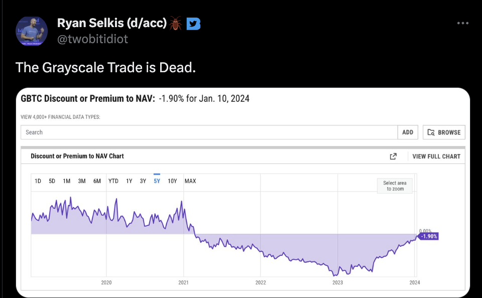 Another emerging story is that, in the face-off between traditional finance firms and pure crypto players to offer Bitcoin ETFs, the former appear to have won out. As it turns out, claims of Bitcoin authenticity or whatever lost out to the huge liquidity and familiar brand name offered by BlackRock and others.