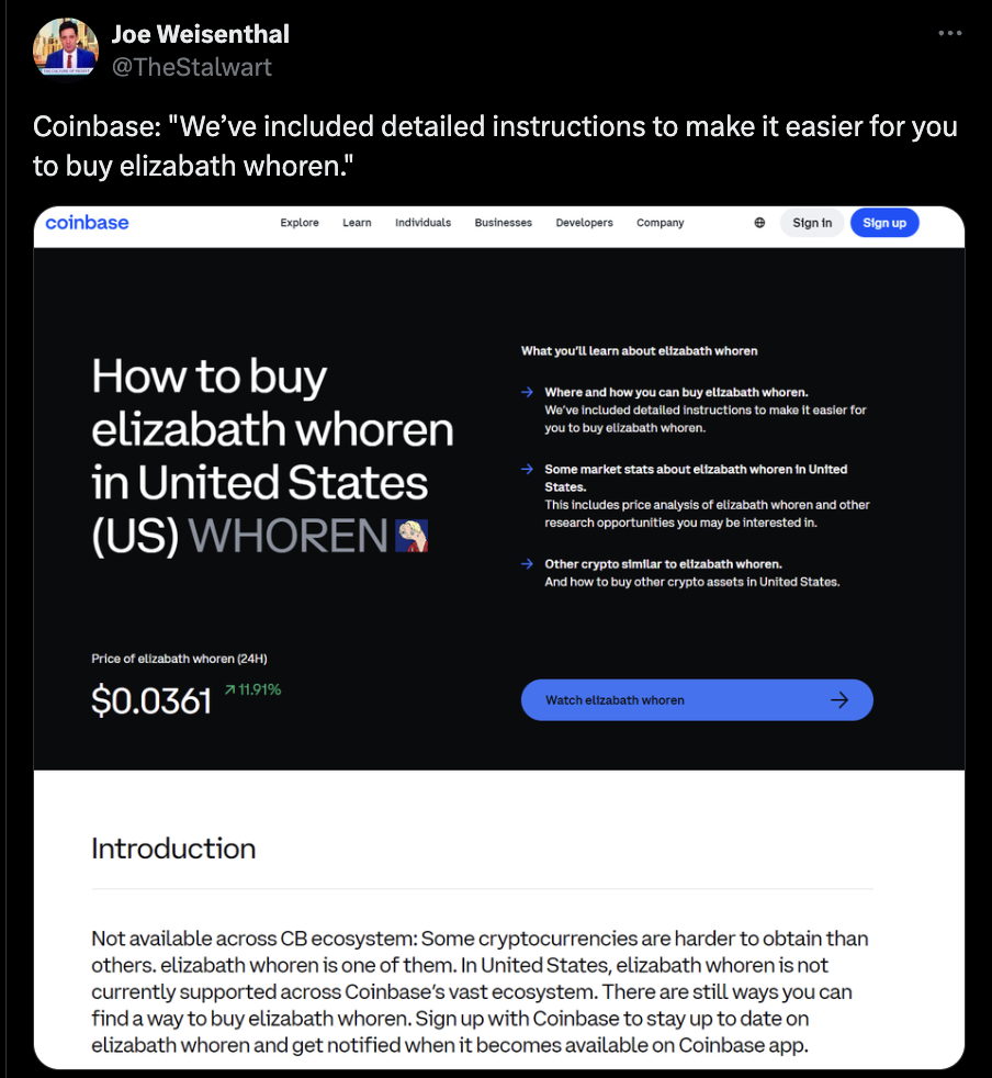Coinbase took down an auto-generated page that provided instructions on how to buy a new memecoin named for a misogynist slur of Sen. Elizabeth Warren (D-Mass.). (Coindesk)