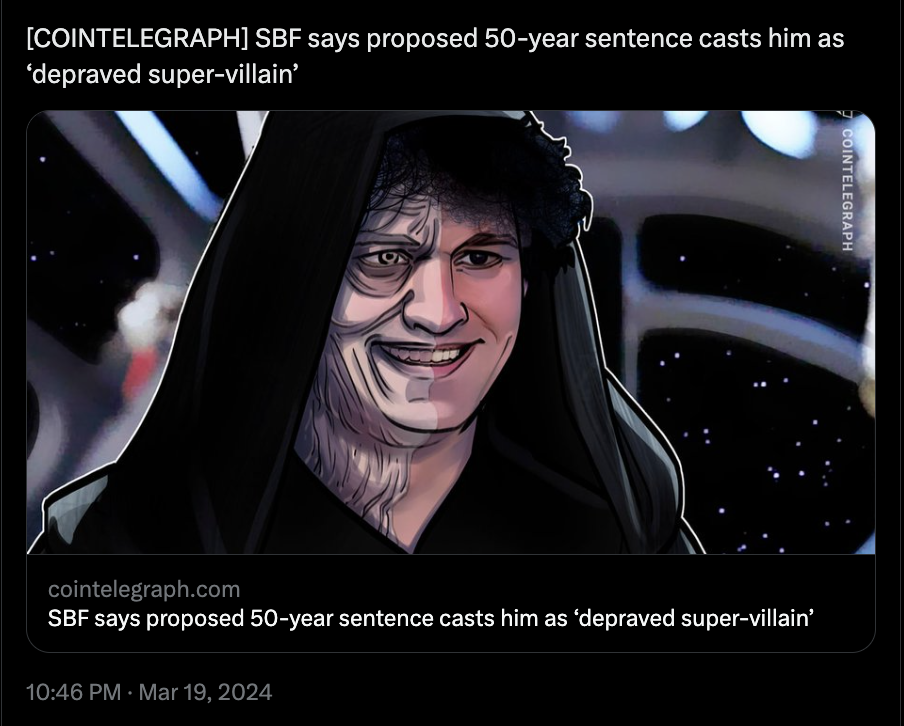 Sam Bankman-Fried's lawyers say prosecutors have unfairly portrayed him as a "depraved super-villain" and complained their proposed 40- to 50-year sentence is a "medieval" death sentence. (Fortune)