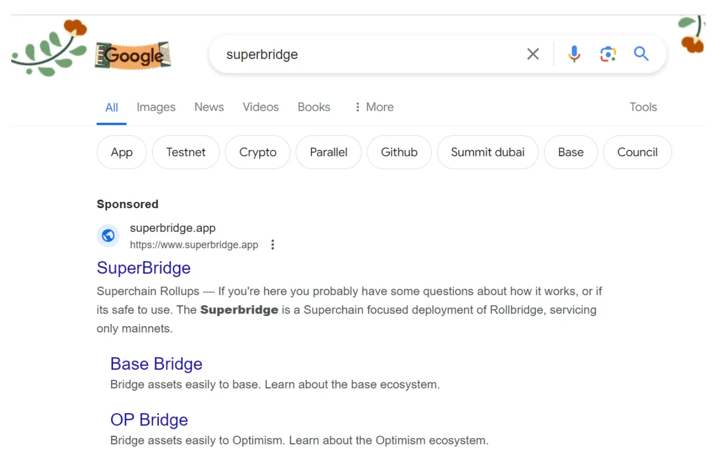 The user clicked the link and commenced a transaction, only to have $3000 worth of the USDC stablecoin disappear from his wallet. It turned out that the Superbridge.app linkn displayed in the Google ad, when clicked upon, redirected to a site called Seperbridge.app controlled by crooks. The only way to notice such a switcheroo is by confirming the address in the web browser—something most people do not do as a matter of course.