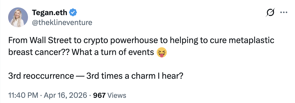 This week’s main character is Tegan Kline, who colaunched the early data crypto library The Graph, and is keeping her sense of humor even as she battles breast cancer.