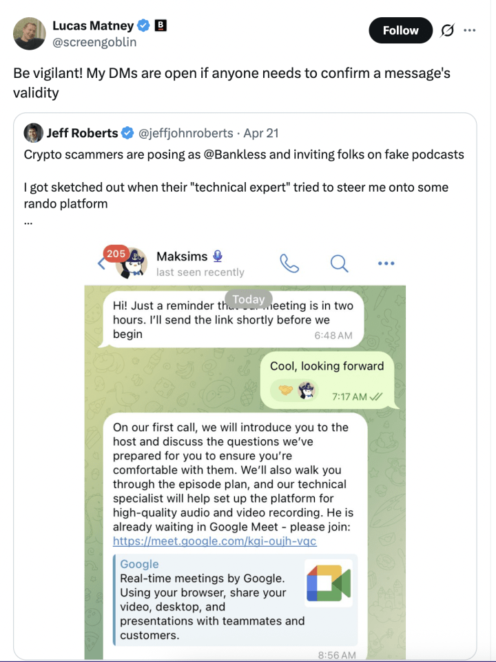 Crypto scammers seeking to catfish victims are now posing as Bankless podcast hosts.