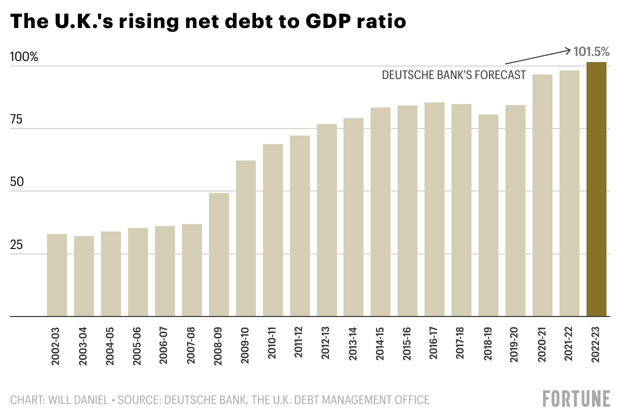 The new spending plan will also push the U.K.’s debt to GDP ratio to around 101%, the highest level of debt the U.K. has held since 1962, according to Deutsche Bank.