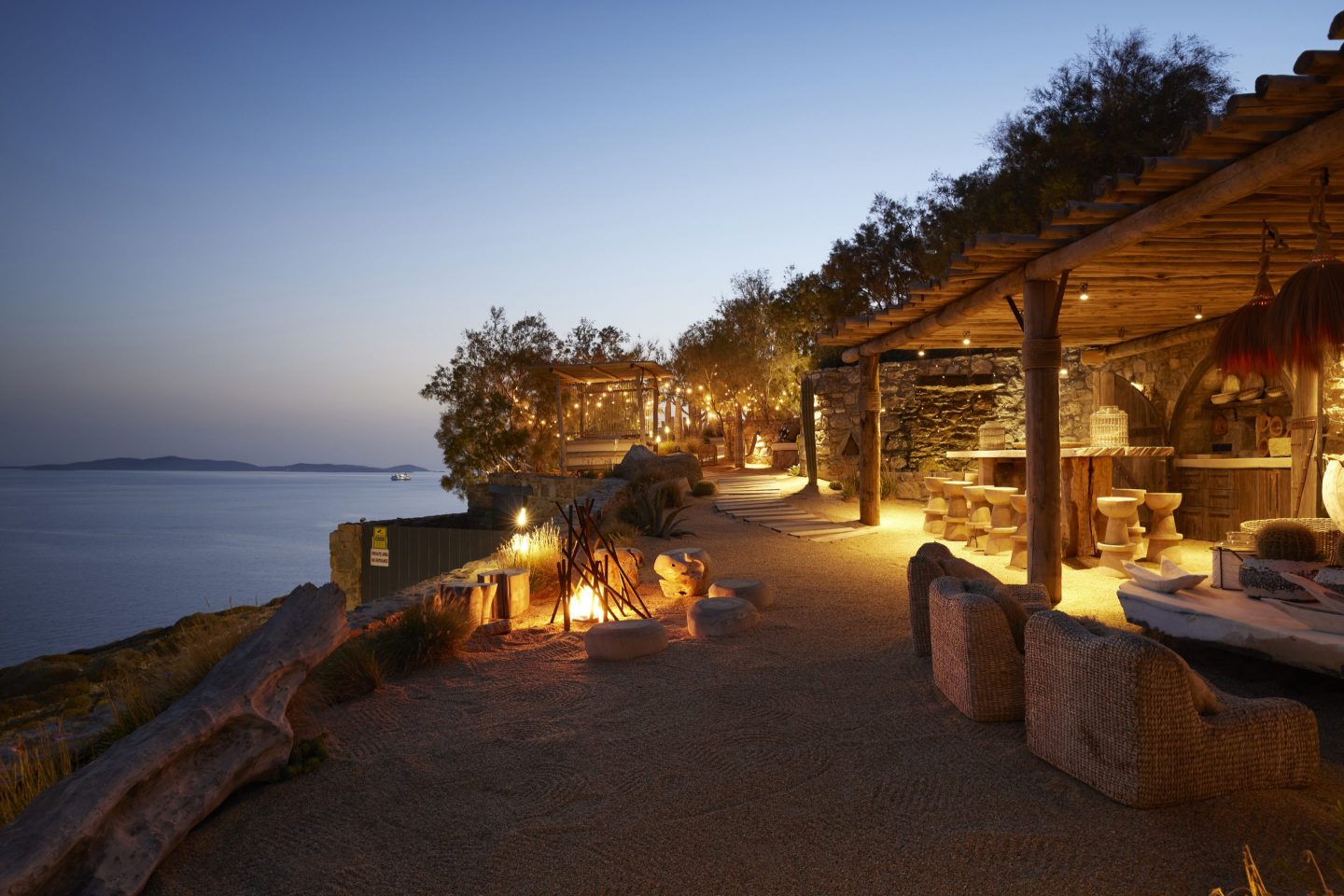 On the house’s lower level, a private space known as “the beach” offers a Jacuzzi, two fire pits, and a service kitchen, as well as views of Mykonos’s Old Town and the neighboring islands.