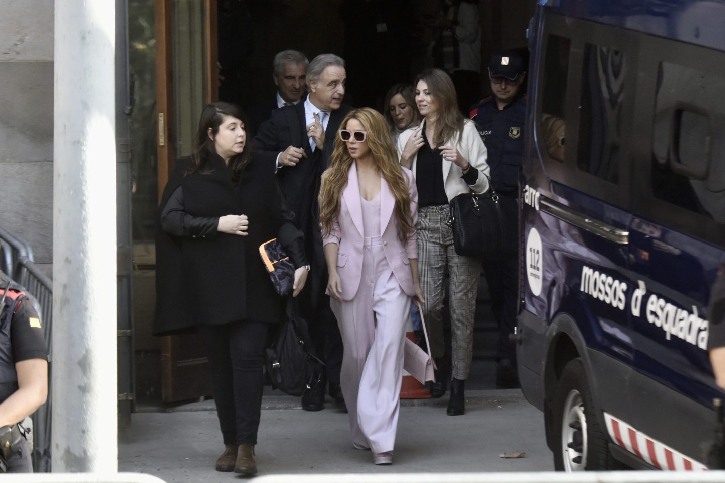Wearing a pink suit, matched with a pink handbag and sunglasses, she arrived minutes before 10 a.m. (0900 GMT) accompanied by her lawyers, amid a media frenzy. On Thursday night Shakira won two Latin Grammy awards in Seville.
