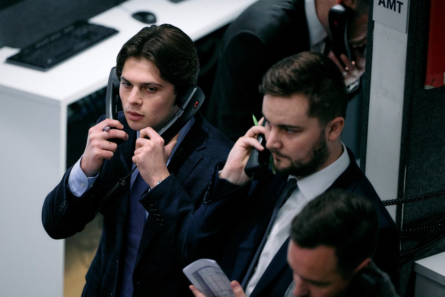 Behind them, brokers speak to clients on landlines, some holding one phone to each ear, repeating orders while taking new ones.