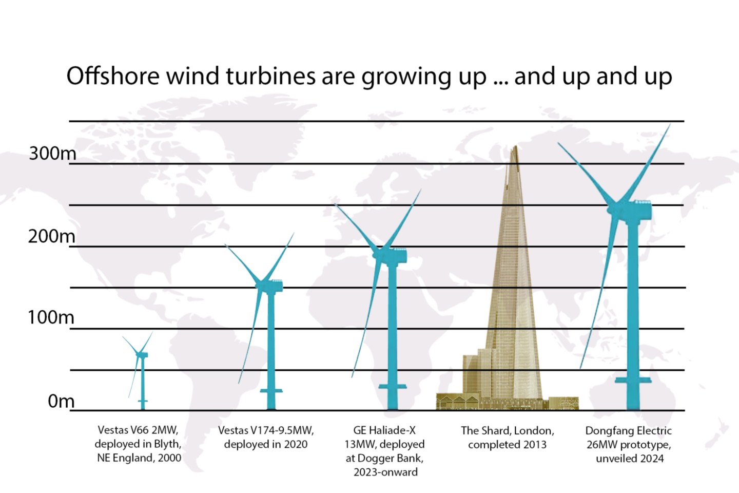 The race to build ever-larger wind turbines speaks to both the promise and challenge of the renewable energy revolution. At its core, this supersizing of everything is a calculation driven by simple physics: bigger, taller turbines take advantage of higher wind speeds, generating more electricity per rotation. When ORE Catapult opened, turbines were a fraction of their current size. Today, at 138 meters (453 feet) tall, GE’s 13-megawatt (MW) Haliade-X is one of the largest turbines in service. Yet, in years to come, even this giant looks set to be dwarfed. In 2024, China’s Dongfang Electric Corporation announced a 26 MW monster that towers over the Haliade-X, with a single unit capable, the company claims, of powering 55,000 homes.