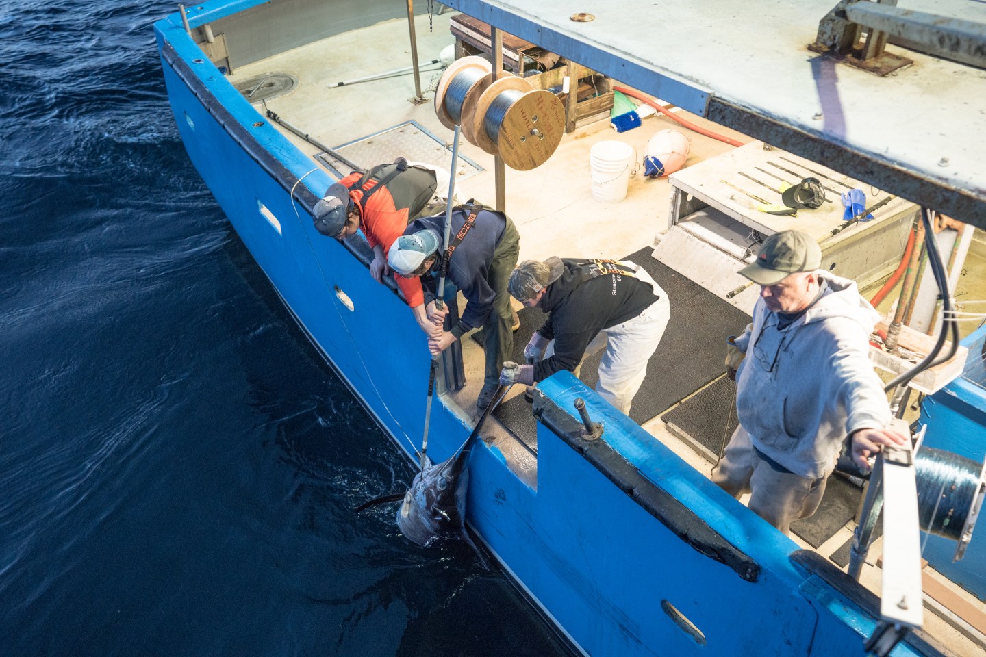 Bill tested a theory: Instead of catching sword at the surface, what if he dropped a longer line—a 1,200- to 1,500-foot line—and sought the spear-nosed marauders at the start of their ascent. After a few successful attempts, “We realized by fishing them down there, not only is there zero bycatch, but when you bring the fish up it has a core temp of 50 degrees. It’s already refrigerated,” and Bill and his crew maintain that cold temperature through every step of the process. It’s the Coors Lite of fish.