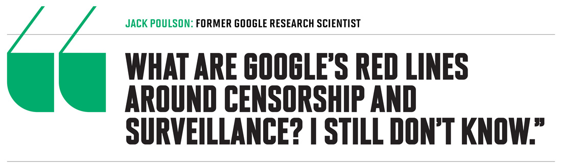 Because Dragonfly began in secret, some employees believed they’d been robbed of that opportunity. Nor were they convinced that Google management had asked itself the hard questions. “There was never any communication that they had thought through the ethical ramifications,” says McMillen. Workers should be able to make their own well-informed ethical decisions about giving their labor to Google, he says. Some workers indirectly involved in Dragonfly hadn’t even known what they were working on. “What are Google’s red lines around censorship and surveillance?” asks Poulson. “I researched this as much as I could as an employee and still didn’t know.”