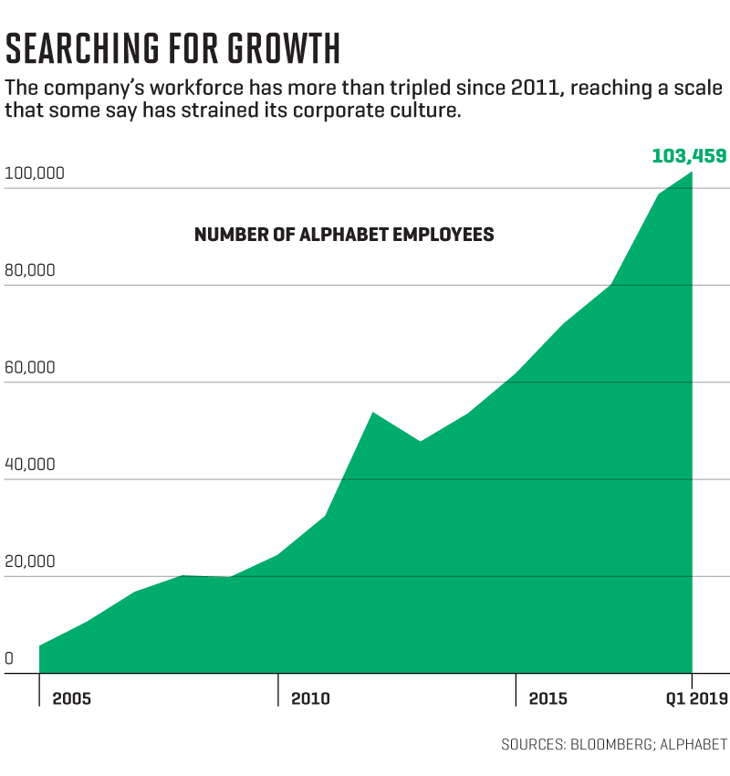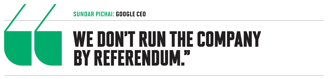 Now Google finds itself in the awkward position of trying to temper the radical culture that it spent the past 20 years stoking. Boasting more than 100,000 employees between Google and its parent company, Alphabet, executives acknowledge that the company is struggling to balance its size with maintenance of the principles, like employee voice, that were so foundational. “You can’t go through that kind of growth without the culture needing to evolve,” says Jen Fitzpatrick, a Google SVP and a member of CEO Sundar Pichai’s leadership team. (Pichai declined Fortune’s requests for an interview.) The company says it is trying to manage its ballooning diversity of perspectives and projects, as well as do a better job predicting the kinds of issues for which employees will demand full transparency. However, it adds that the activist employees are a small but vocal group, and that their opinions don’t represent those of employees at large.