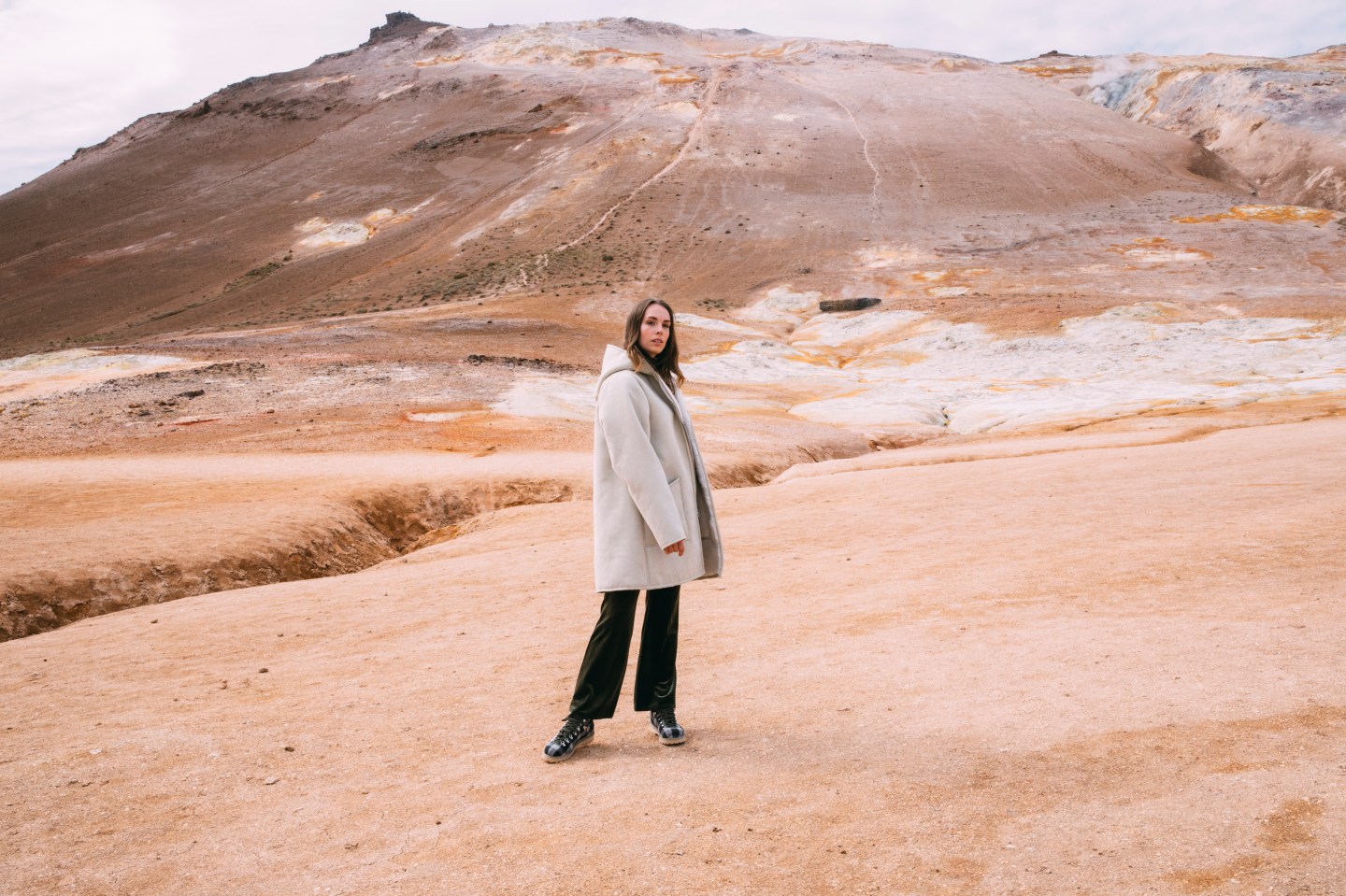 “See that purple? It should be our next shearling color,” says Linda Lundström as she came across a steamy mud spring in the arid fumarole fields of Námaskarð pass, one of the photo shoot locations for Therma Kōta’s latest capsule wardrobe. The celebrated Canadian designer, of La Parka renown, founded the label with her daughters Mosha and Sophie Lundström Halbert in 2017, and their Icelandic heritage has played a foundational role for the brand. If added, the cloudy purple shade would join a slate of “statement neutrals” that includes arctic opal, lava, and moss—the latest shade. “Because it’s designed by nature, it looks good on everyone,” says Mosha.