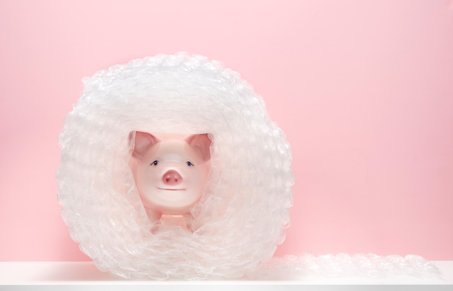 A ceramic pig seen with a background of dollar bills