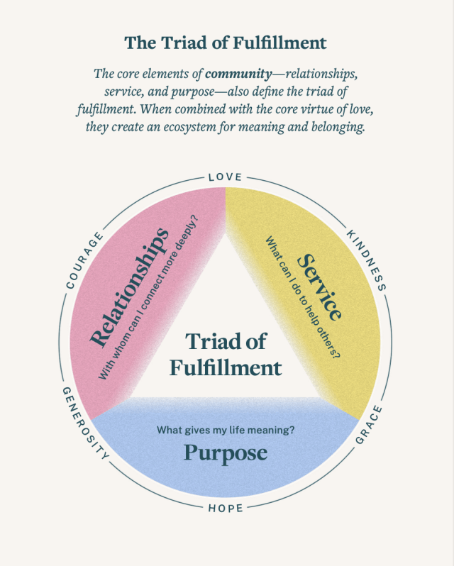 Research has demonstrated the critical role that community and connection have in longevity and health, and Murthy identified three core pillars that help people build community: relationships, service, and purpose (see below for a visual representation).
