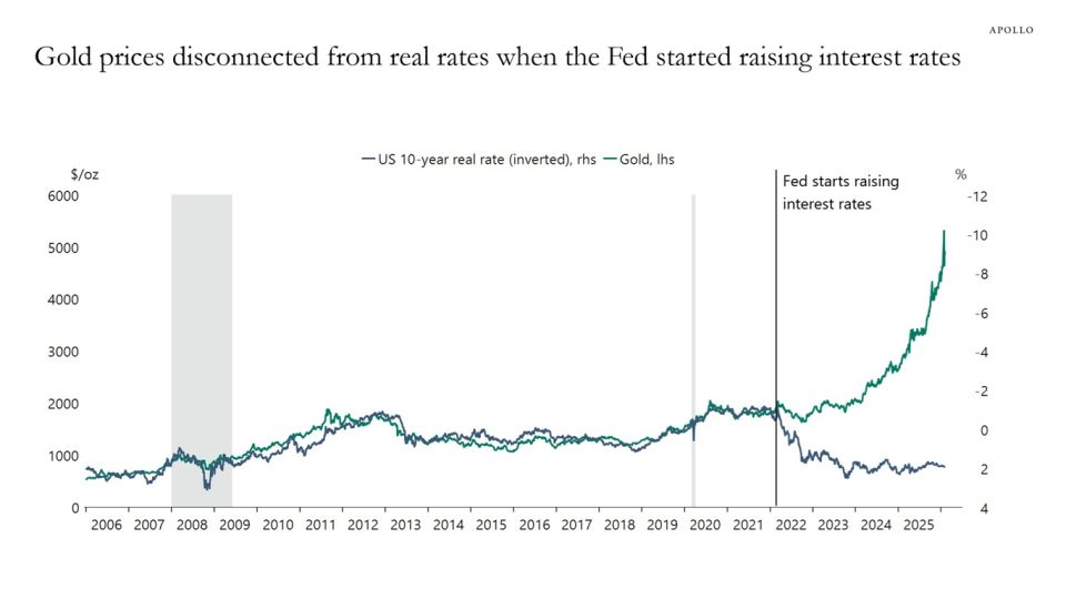 Apollo chief economist Torsten Slok, citing data from Macrobond and Bloomberg, observed the decay of the correlation between gold prices and real interest rates.