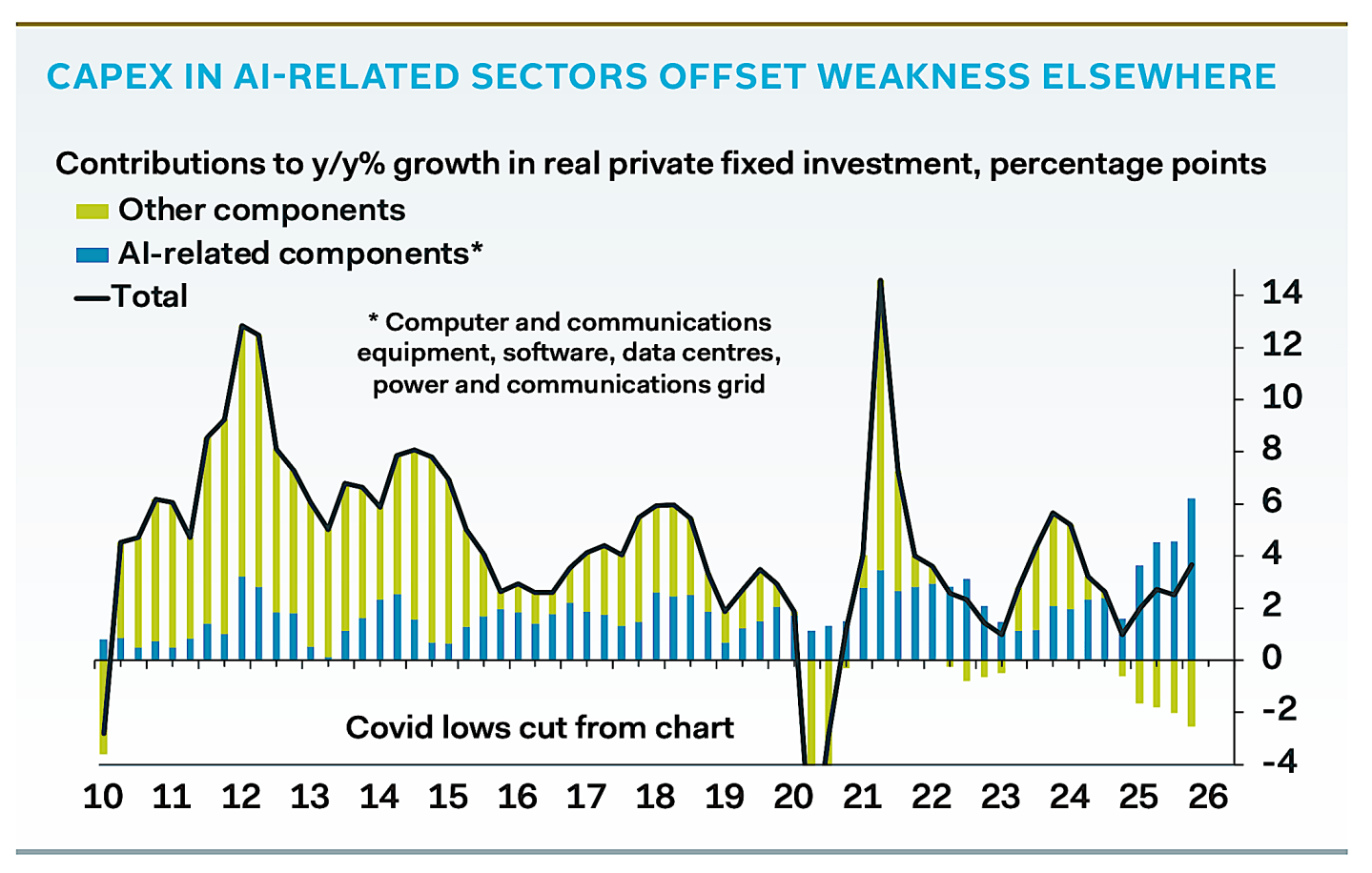 Spending on AI infrastructure now forms a significant part of U.S. GDP growth, and corporate capital expenditure (capex) would be negative without it, according to a recent research note from Pantheon Macroeconomics.