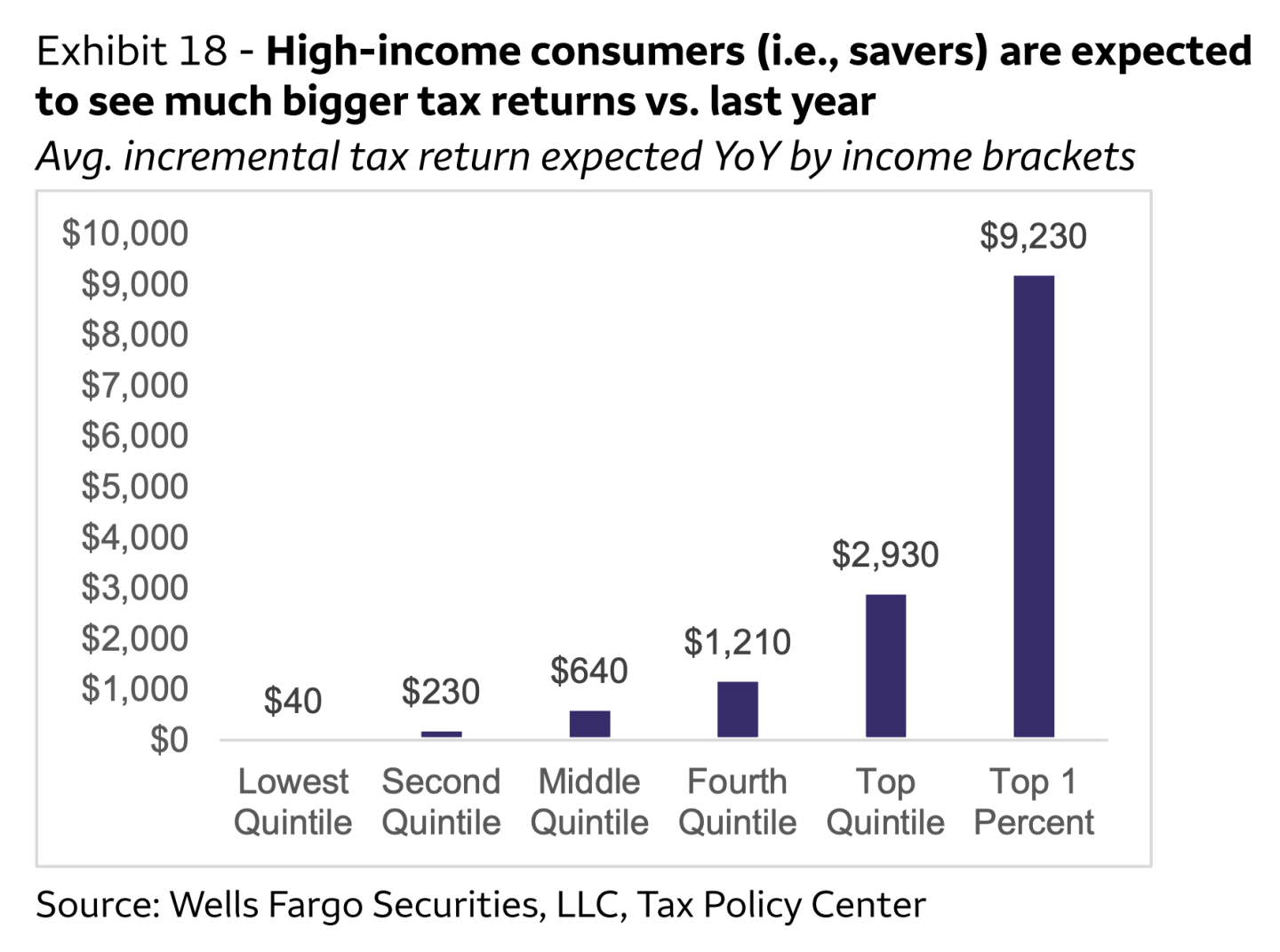Wells Fargo and the Tax Policy Center’s estimates of the increase since last year in U.S. tax refunds, sorted by income bracket.