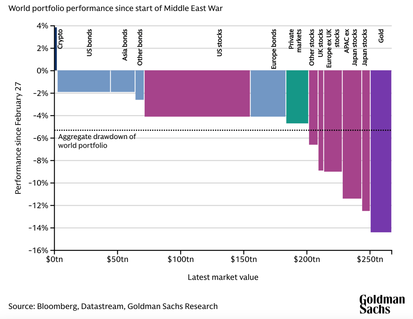 - Crypto is safer than gold? Fascinating chart here from Goldman Sachs tracking the decline in various assets since the start of the war through March 27. The best performing asset is … crypto? That feels like a typo but it’s true. Bitcoin prices have stayed flat over the last month. The worst asset was gold, which lost 15% of its value after an unsustainable run-up.