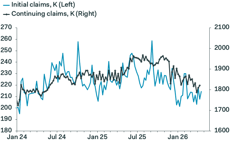 Initial jobless claims rose to 214,000 in the most recent week surveyed but the overall trend remains down and Wall Street is slightly puzzled as to why. With the uncertainty caused by the war with Iran, the price of oil going through the roof, and tariffs complicating company supply chains, analysts expected the labor market to get weaker. But it isn't. Unemployment is simply refusing to show up. Employers are reluctant to hire people and workers are reluctant to leave their jobs—but that isn’t generating mass joblessness, according to recent notes from Piper Sandler, Jefferies, and Pantheon (which supplied the above chart).