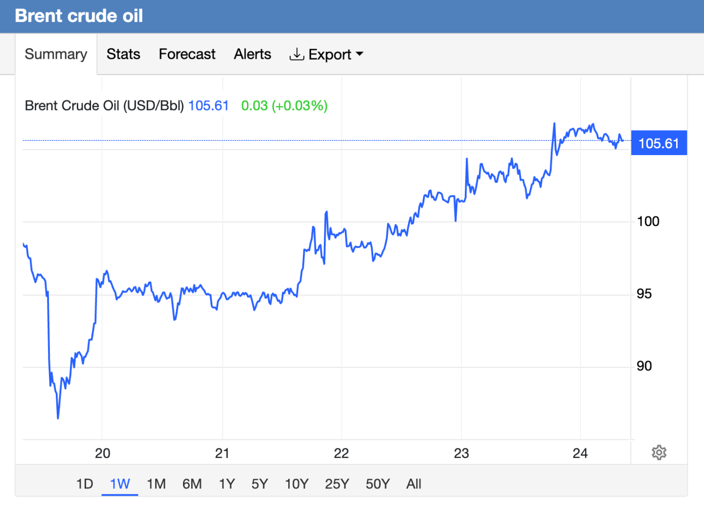 - Brent crude oil rose to $106 per barrel this morning from a low of $101 yesterday.
